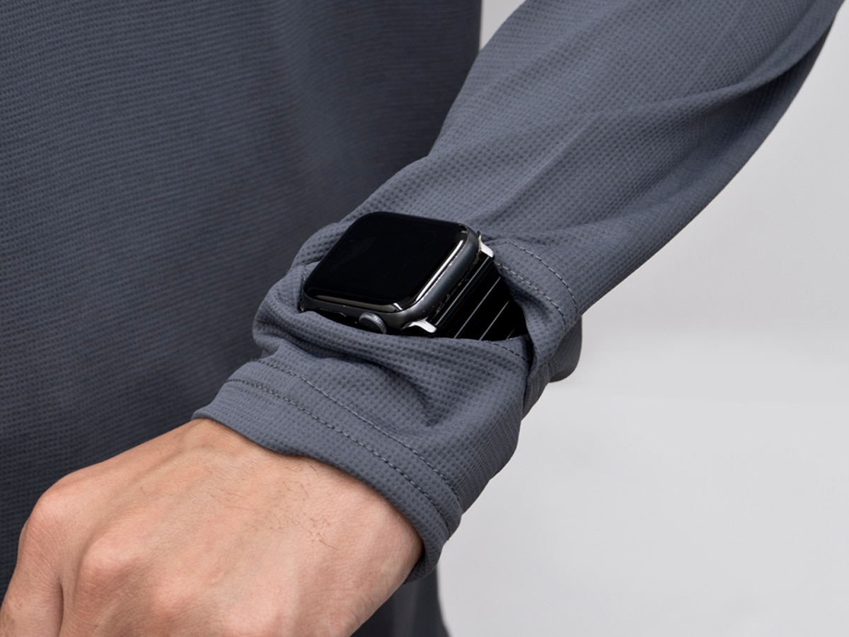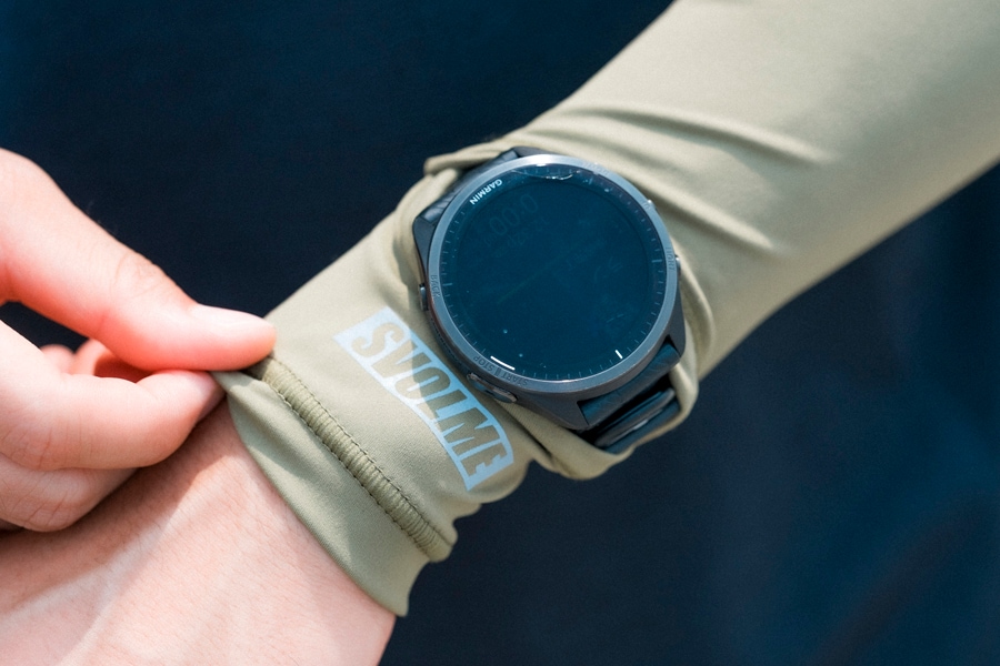 左の袖口には、腕時計を出せるスリットを採用。手首までカバーした状態でも、心拍機能を搭載したランニングウォッチを確認できる。