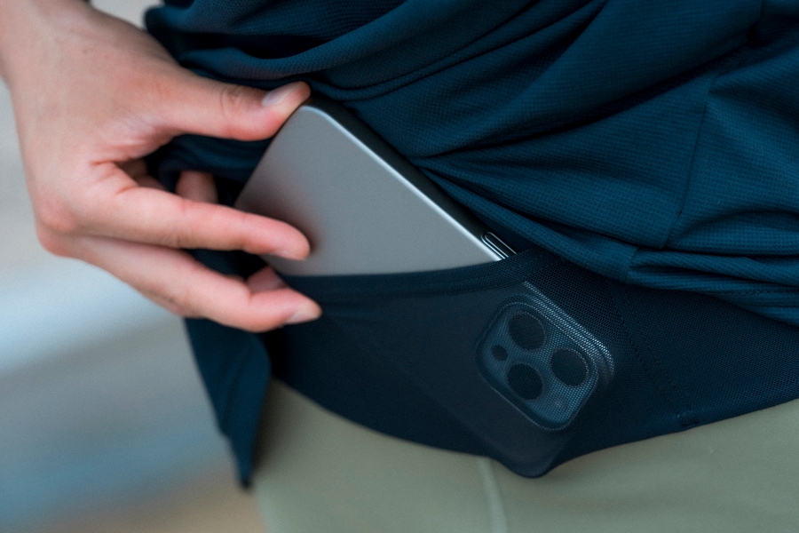 ウエスト全体に高ストレッチ素材のポケットを配置。右の前ポケットには、ファスナーがついているので、鍵などの貴重品でも安心して収納できる。