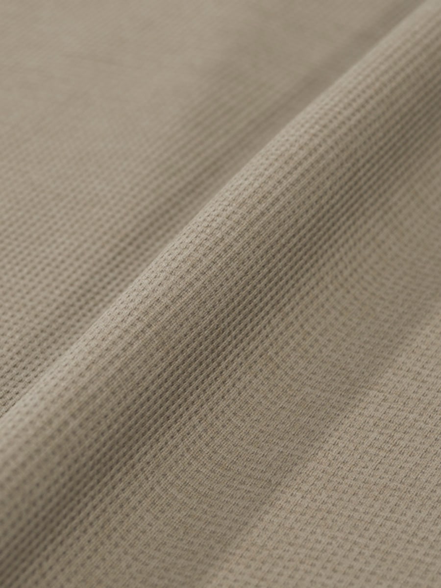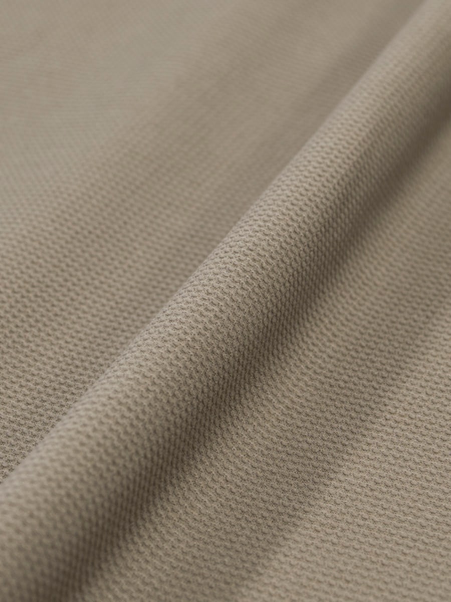 天然繊維のような見た目と風合いながら、吸汗速乾・高伸縮・UVカット機能を兼ね備えており、汗をかいてもサラリと快適な着心地を実現する。